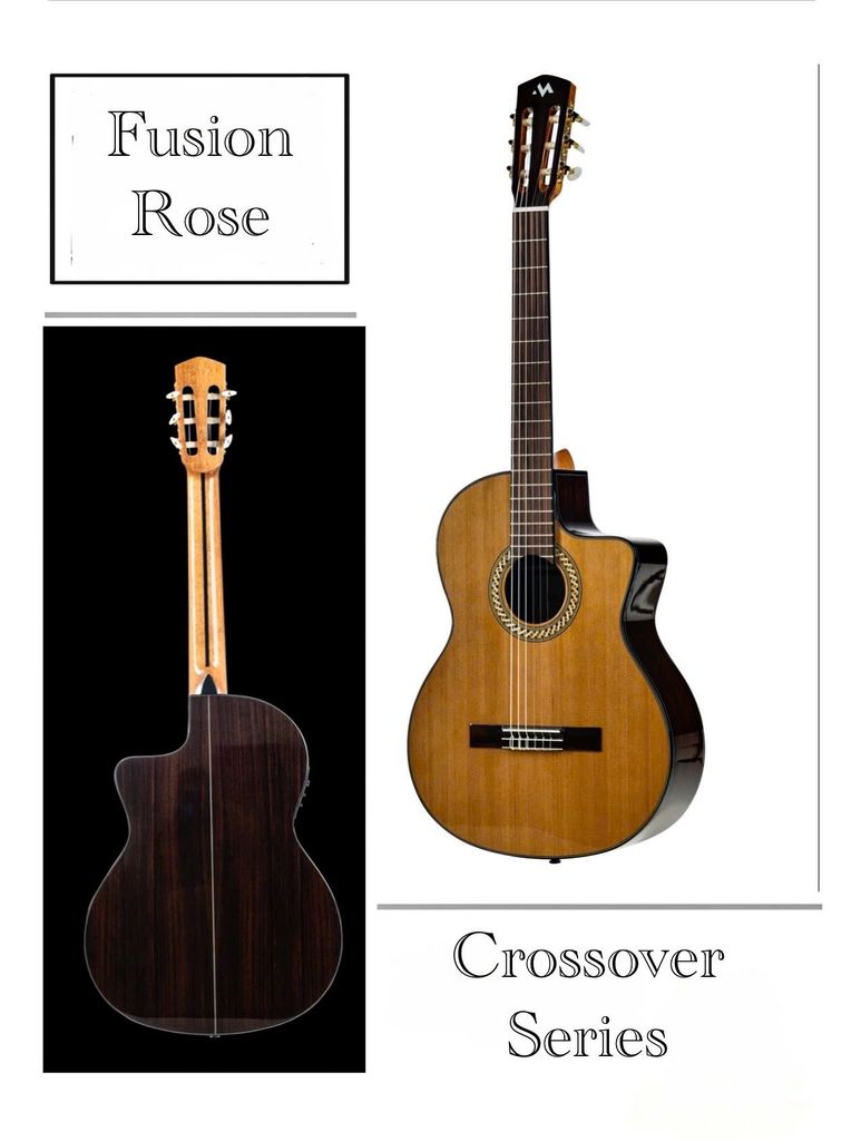 The Murcia Fusion Rose is one of our high level model Fusion guitars. Available with a solid Canadian cedar top and rosewood back and sides, this model's main feature is small neck profile 48mm Nut width and only 12 frets to the body, which maximizes the amount of resonance and vibration across the soundboard. Murcia Fusion Rose is the perfect blend of classic Spanish designs with modern aesthetics and high gloss PU finish. Ready to plug in and play, the Murcia Fusion Rose comes equipped with the Fishman Classical Blend preamp.