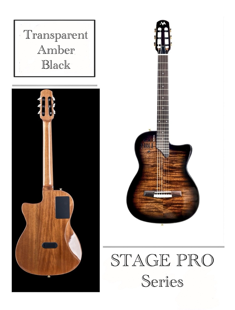 Murcia Stage Amber Transparent Black is the stage acoustic-electric concept. Pairing a Flamed Maple Veneer top and Mahogany body, the neck with a comfortable 48mm nut width which is slightly thinner than a traditional nylon string guitar and provides a playing experience closer to a steel string guitar. At the heart of the Murcia Stage is the custom Murcia multiac dual source system 2 body sensors undersaddle bridge pickup, which is equipped with easy-to-access Volume, EQ, and Body Blend knobs allowing players to dial in their preferred acoustic tone on stage or in the studio.