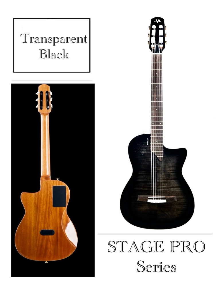 Murcia Stage Transparent Black is the stage acoustic-electric concept. Pairing a Flamed Maple Veneer top and Mahogany body, the neck with a comfortable 48mm nut width which is slightly thinner than a traditional nylon string guitar and provides a playing experience closer to a steel string guitar. At the heart of the Murcia Stage is the custom Murcia multiac dual source system 2 body sensors undersaddle bridge pickup, which is equipped with easy-to-access Volume, EQ, and Body Blend knobs allowing players to dial in their preferred acoustic tone on stage or in the studio.